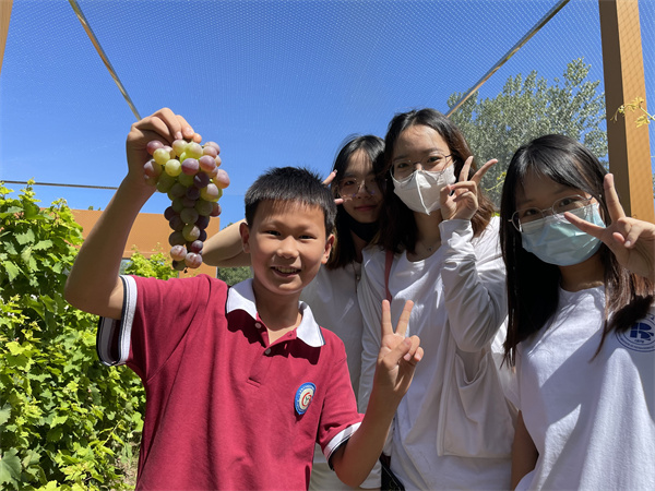 队员与小朋友们一起来到“劳动乐园”,果园里有采育三小各年级同学种植的葡萄、圣女果、茄子以及大葱等常见作物,在采育三小指导教师张文远的讲解下,队员们与小朋友们一起采摘成熟的葡萄,呼唤声欢笑声汇成一片,凝结成了学生们成长路上的珍贵回忆。