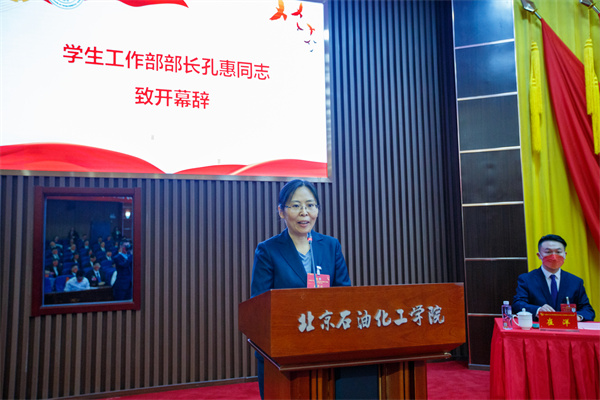 学校学生工作部部长孔惠致开幕词,学校工会常务副主席王红梅代表群众团体致词,共青团中央常委、北京大学团委书记户国栋代表兄弟高校团委致词。