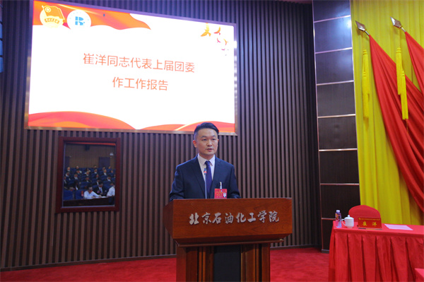 北京石油化工学院团委副书记(主持工作)崔洋代表第五届团委作题为《不忘初心跟党走 青春奋进新征程 为全力打造新时代首善之区工程师摇篮贡献青春力量》的工作报告。报告分为六个部分: