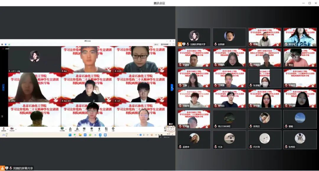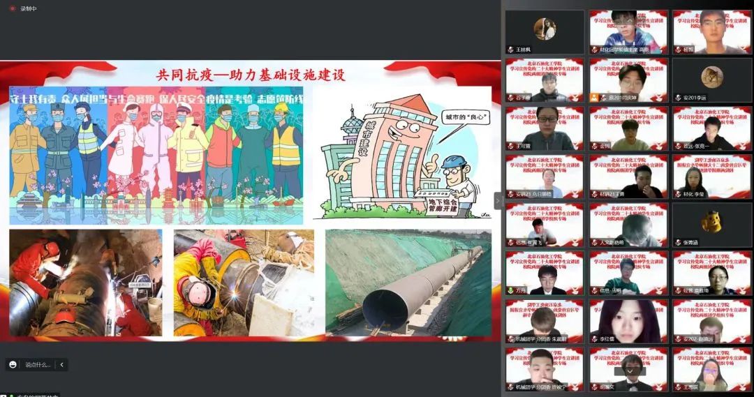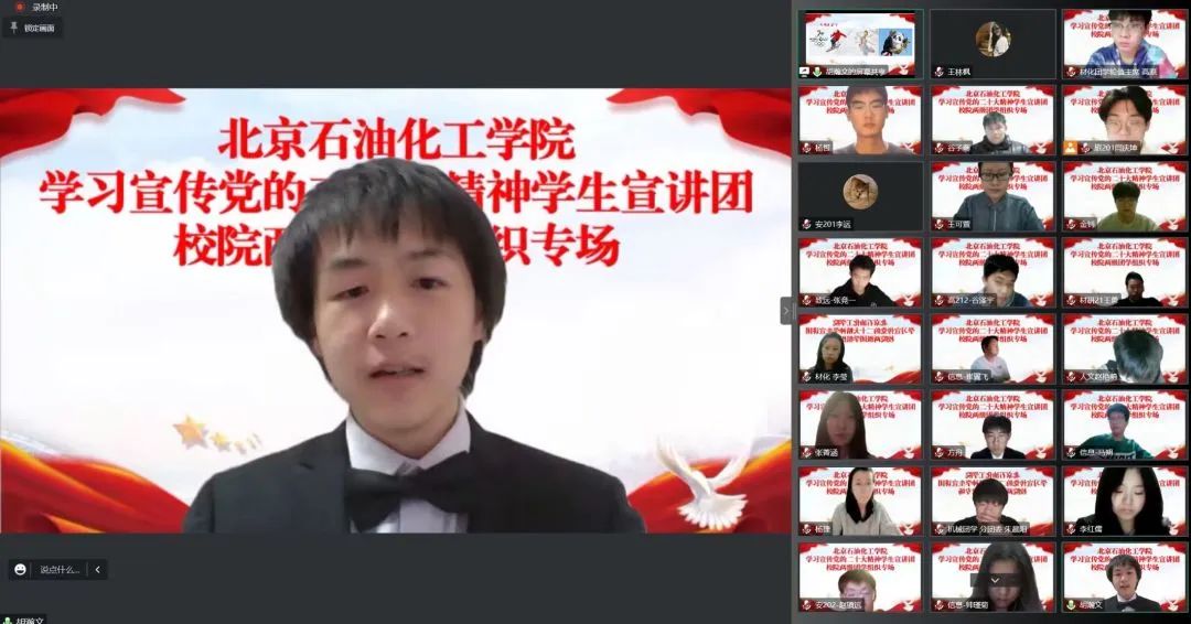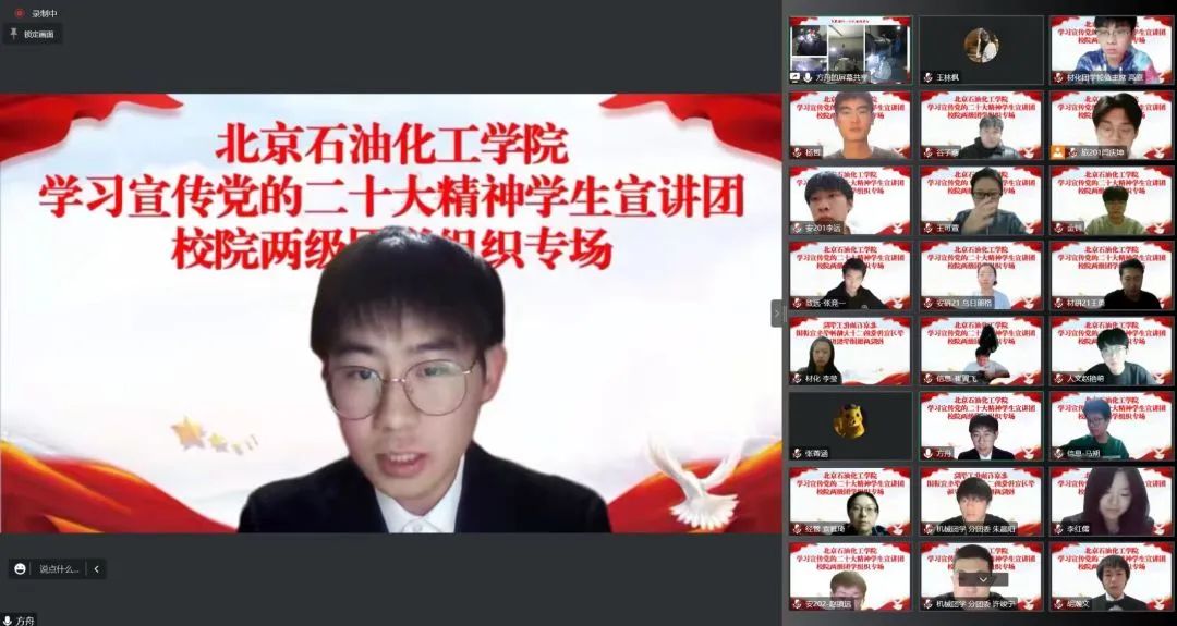 为深入学习宣传党的二十大精神,持续推动党的二十大精神入脑入心,强化对我校学生干部的思想引领,1月4日晚7点,北京石油化工学院学习宣传党的二十大精神学生宣讲团校院两级团学组织专场活动在线上成功举办。