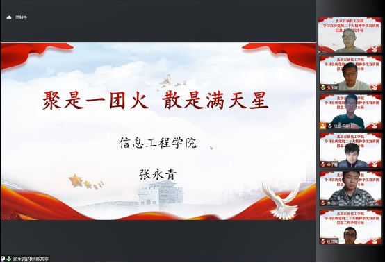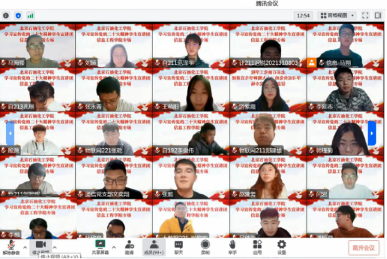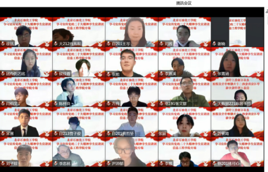 2023年1月11日晚,北京石油化工学院学习宣传党的二十大精神学生宣讲团受邀为我院学子在腾讯会议进行党的二十大精神宣讲,信息工程学院各年级学生党员、学生干部、入党入团积极分子、青年学生代表等共计300余人参加活动。