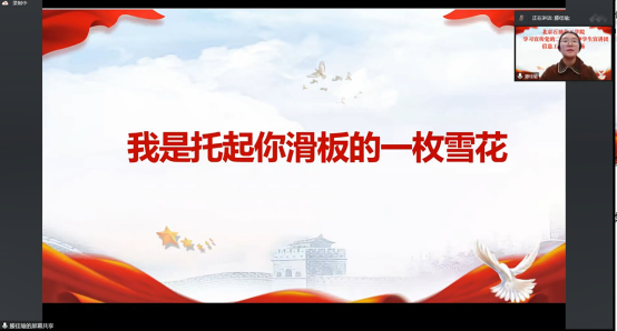 滕佳瑜同学以“我是托起你滑板的一枚雪花”为题讲述了自己在2022年北京冬奥会、冬残奥会上的志愿服务经历。默默无闻的“我”托起的是久违的梦想,让我们一起面向未来的诗和远方。