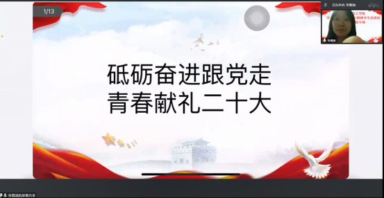 张菁涵同学以“砥砺奋进跟党走,青春献礼二十大”为题分享了党的光荣精神传承。我们坚信中国共产党定不负众望,带领广大人民走向幸福安康。