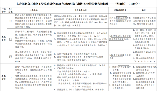 北京石油化工学院共青团始终将基层组织建设作为工作重点,通过增强思想引领力、凝聚组织向心力、锻造贯彻执行力、提升青年服务力,以“两张成绩单”为制度载体,扎实推进团学组织标准化规范化建设。开展了学代会研代会,校院两级交流会,“活力团支部,魅力团支书”评选,学生组织理论学习等活动。