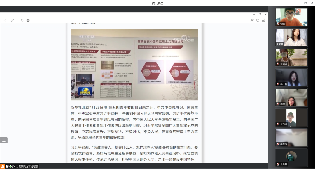 4月25日上午,在五四青年节即将来临之际,中共中央总书记、国家主席、中央军委主席习近平来到中国人民大学考察,与师生代表座谈并发表重要讲话。习近平代表党中央,向全国各族青年致以节日的祝贺,向中国人民大学全体师生员工、向全国广大教育工作者和青年工作者致以诚挚的问候。习近平希望全国广大青年牢记党的教诲,立志民族复兴,不负韶华,不负时代,不负人民,在青春的赛道上奋力奔跑,争取跑出当代青年的最好成绩!习总书记考察中国人民大学引发了北石化学生热议。26日中午,各学院学生代表于线上召开学习重要精神的座谈会,集体收看新闻联播相关片段,学习习总书记考察中国人民大学的重要讲话精神。