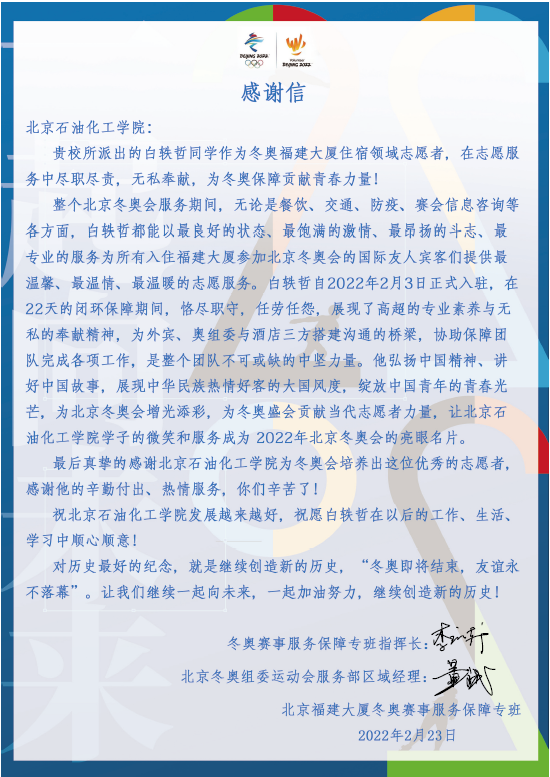 近日,学校收到北京福建大厦冬奥赛事服务保障专班发来的感谢信,点赞我校白轶哲同学在服务冬奥会期间的优秀表现。我们有幸采访到了这位同学,让我们一起听听他与冬奥会的故事吧!