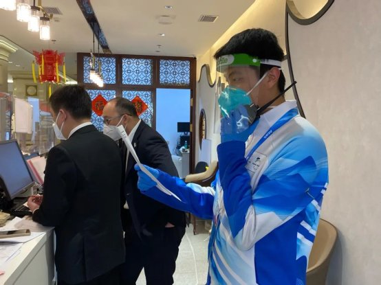 白轶哲:作为利益相关方住宿志愿者,我主要的职责是英语翻译。日常工作是为酒店的外国宾客提供帮助、解决问题,在前台接打外宾电话,帮助酒店工作人员以及疫情防控组进行各项工作,与外宾的新冠联络官往来邮件、电话等。