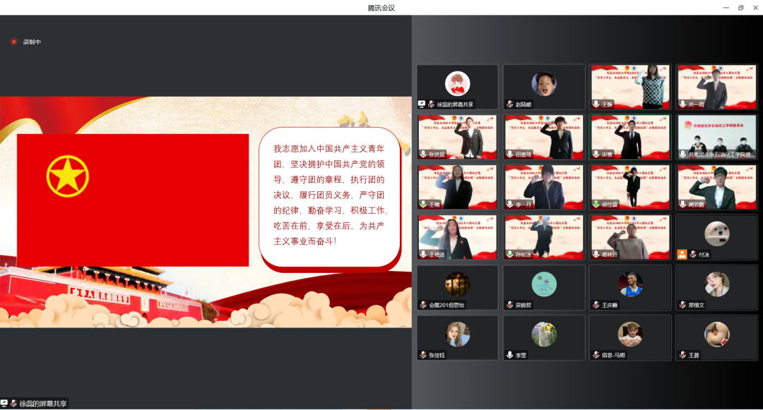校团委书记崔洋老师,副书记谷子骞、蒋林轩(学生),校团委杨哲老师,各学院团委书记、副书记(学生)以及本学期推优入党积极分子、入团积极分子共500余名师生线上参加入团仪式。仪式由校团委组织部部长王静主持。