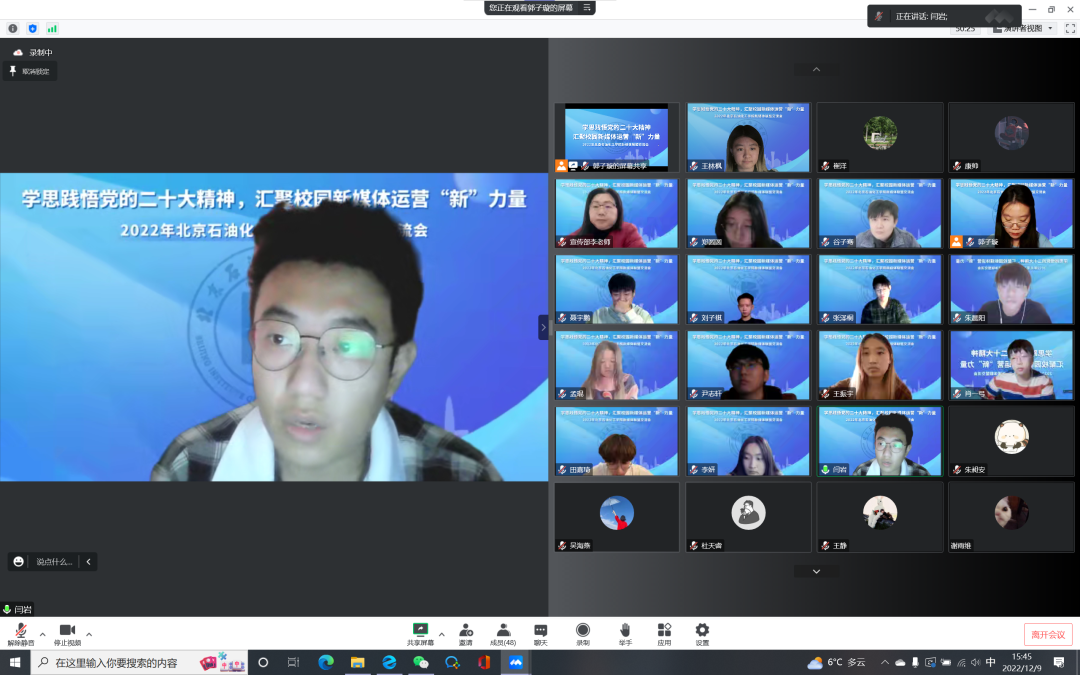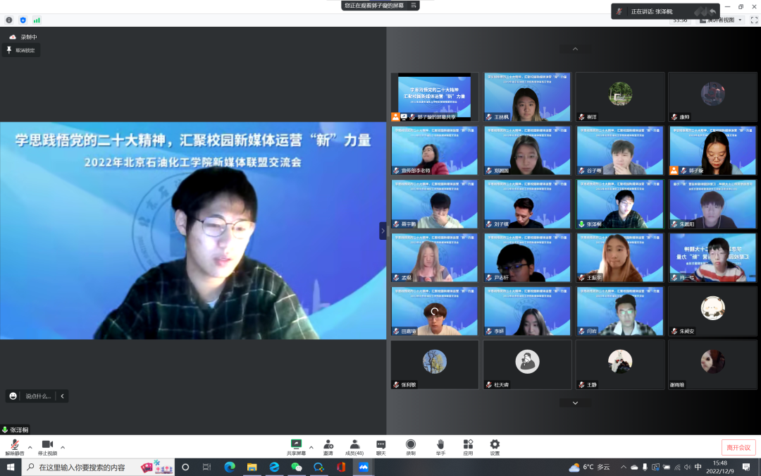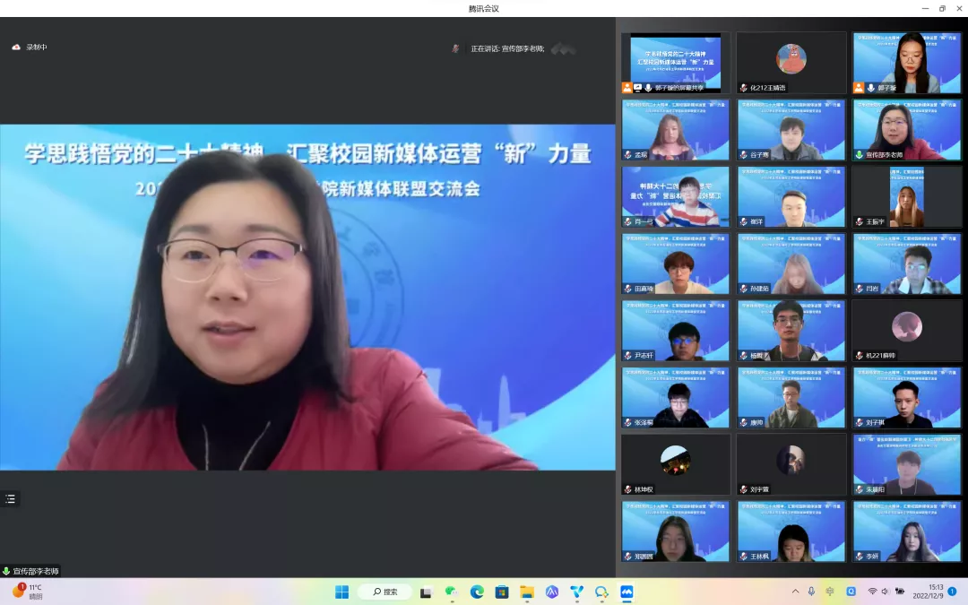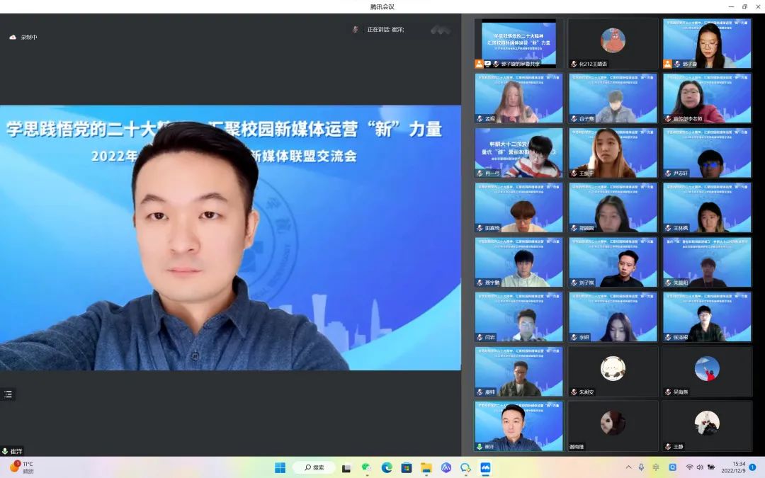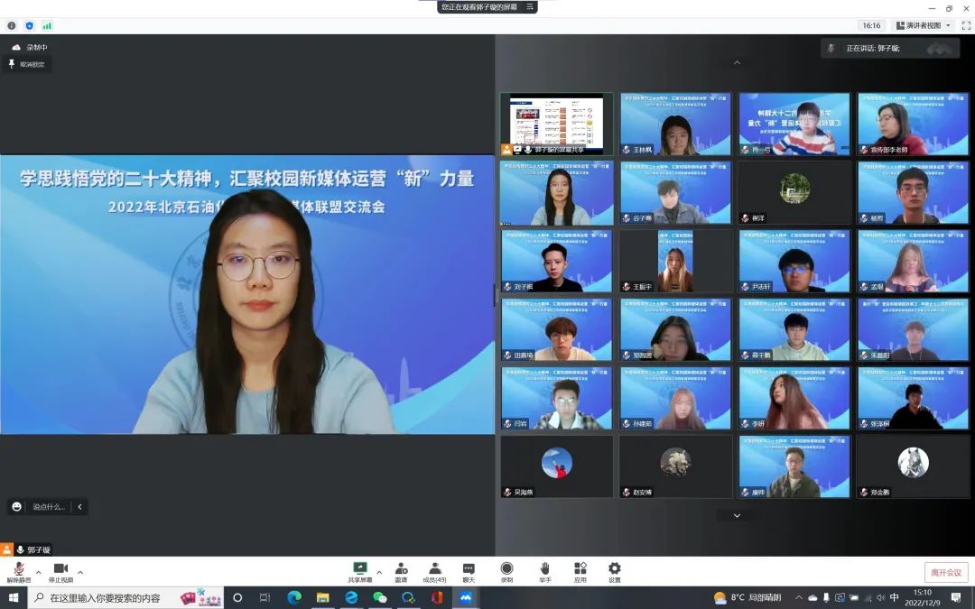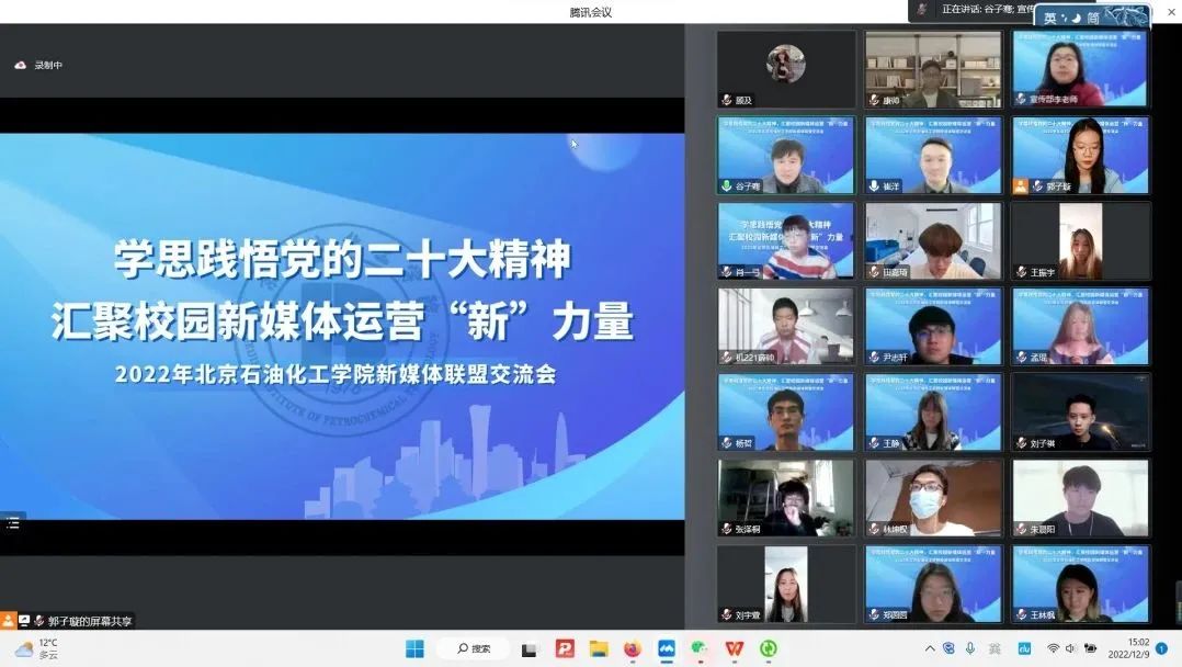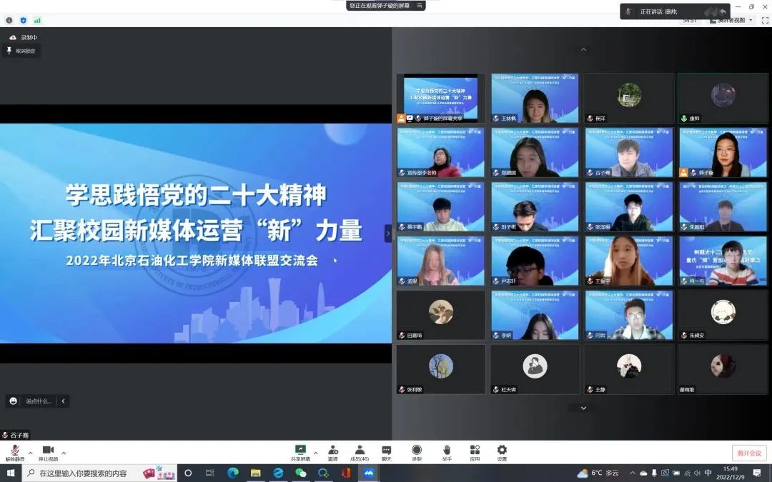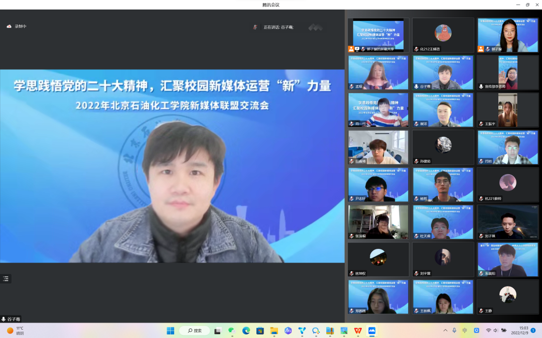 为深入学习贯彻党的二十大精神,加强北石化新媒体平台之间的交流共建,进一步提升学校新媒体宣传工作质量,同时提升学校团属新媒体对广大青年团员的引领力和影响力,2022年12月9日,由校党委宣传部牵头、校团委主办的新媒体联盟交流会在线上召开。