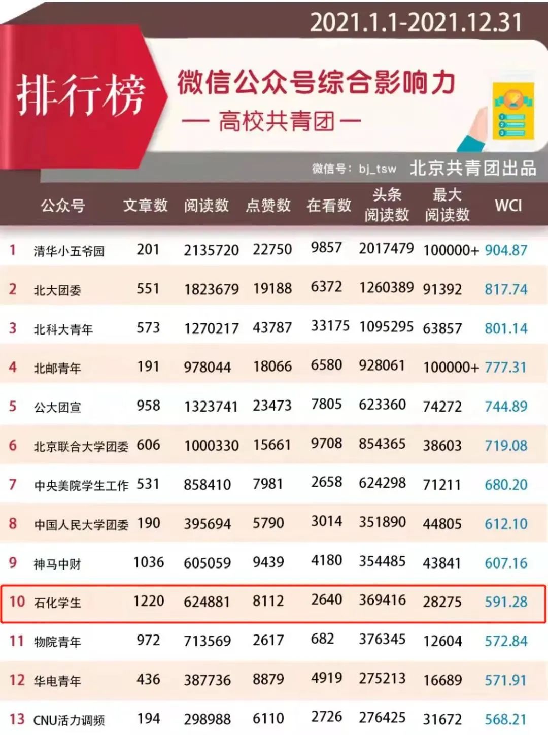 2022年3月17日,北京青年发布了北京共青团系统微信排行榜,根据官方数据,我校石化学生公众号在高校共青团微信公众号综合影响力年度排行榜中位列第十名!