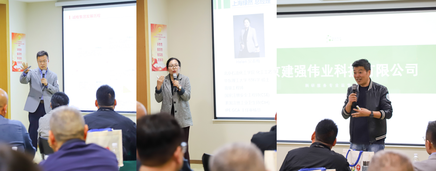 主题分享环节,高强校友结合诚格集团二十余年深耕,介绍了企业在安全应急与个人防护装备领域的研发历程。吴春梅校友分享了绿然环境在环保低碳咨询、企业合规及碳足迹管理方面的业务布局。高建校友介绍了建强伟业从科研服务起步向全国多区域布局的发展之路,并表达对母校培养的感恩。